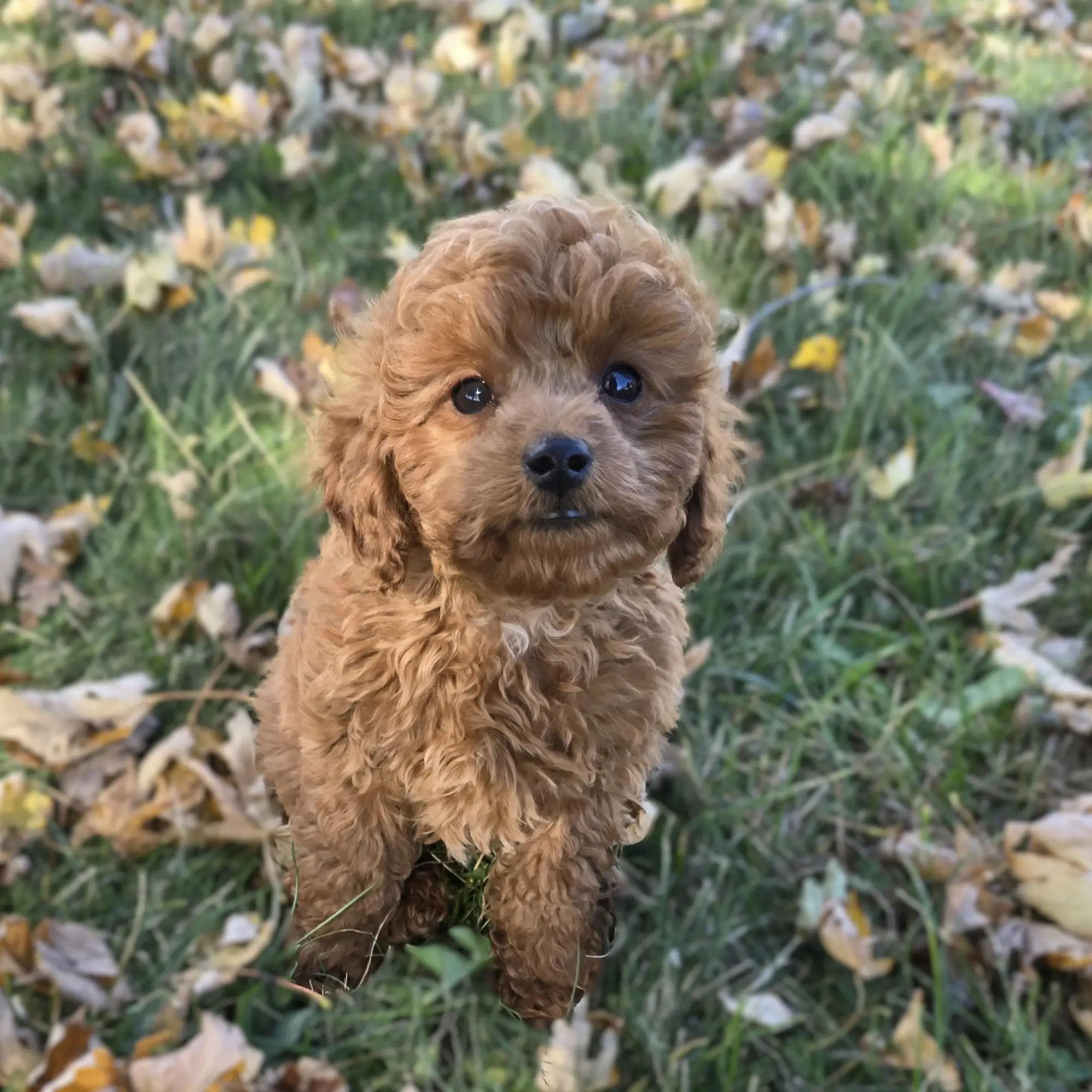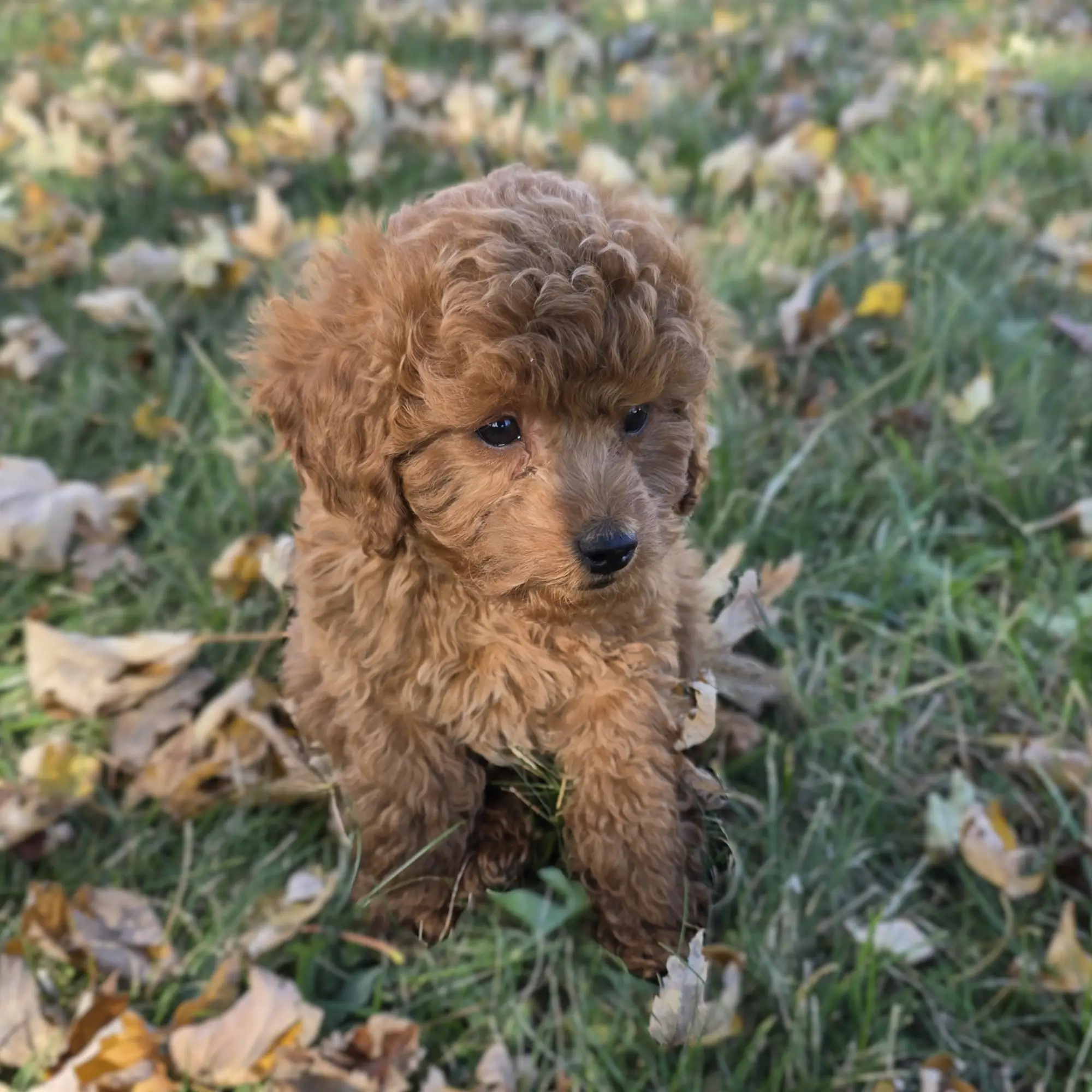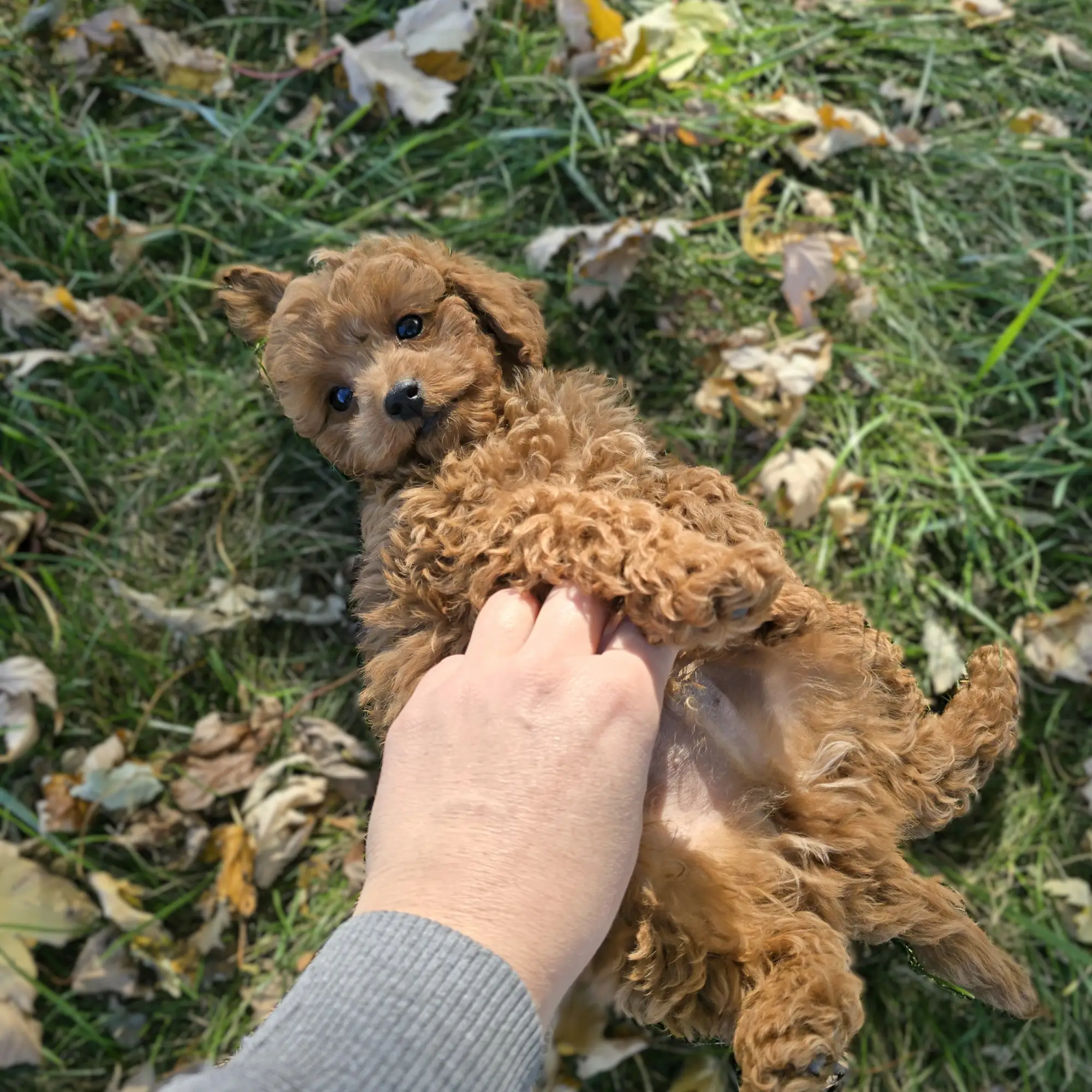 Oso is a F1B Mini Goldendoodle — 75% Mini Poodle and 25% Golden Retriever. He was born on August 26th, 2025, and is expected to weigh around 12–15 lbs when fully grown. His dad is a 6.5 lb. Miniature Poodle, and his mom is a 22 lb. Mini Goldendoodle, giving him the perfect mix of traits from both parents.