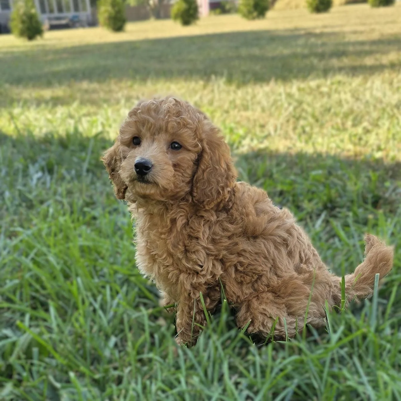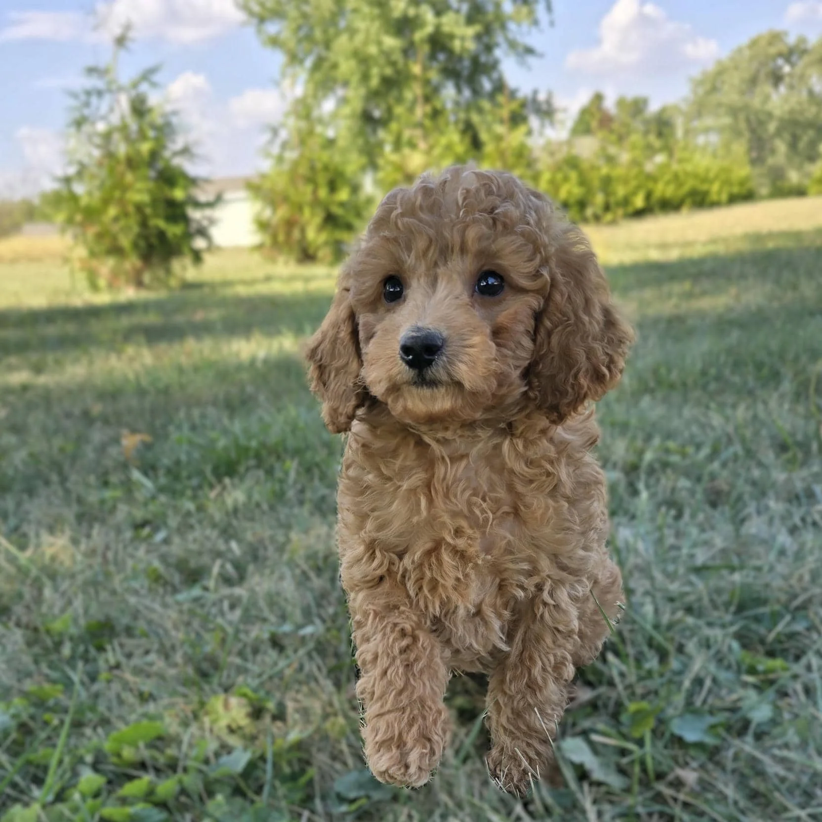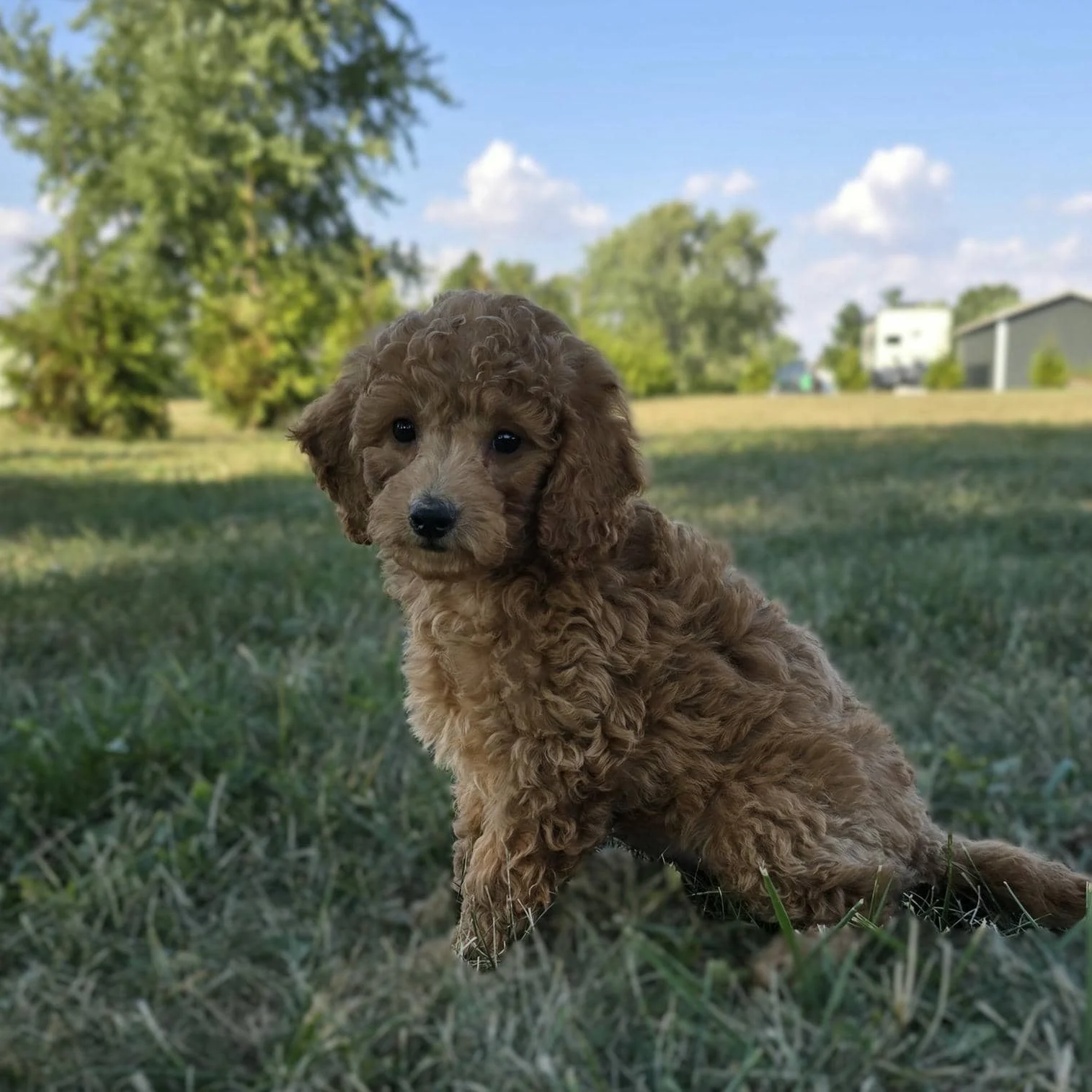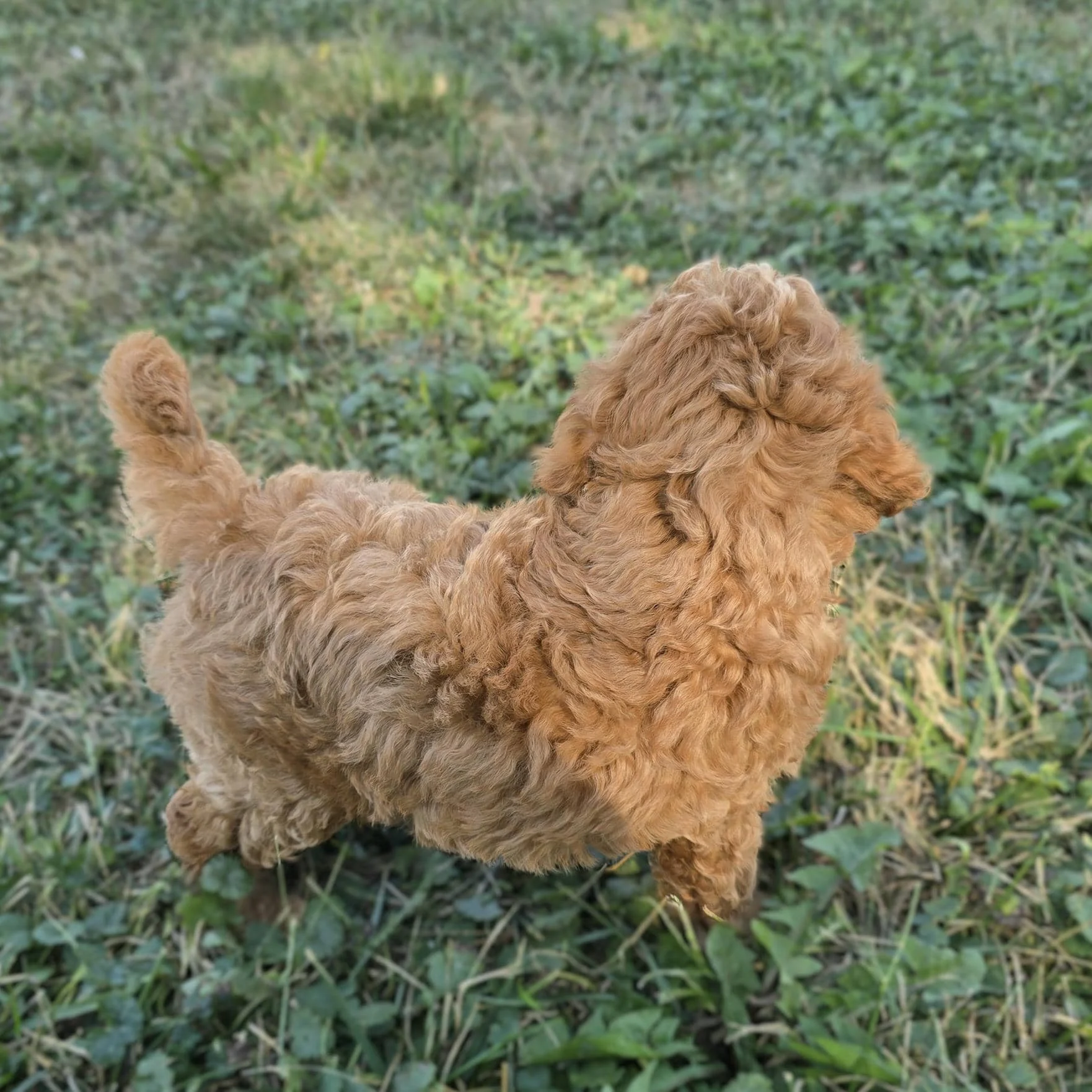 Boy 1751 is a F1B Mini Goldendoodle. He’s 75% Mini Poodle and 25% Golden Retriever. He was born on Aug. 6th, 2025, and will weigh approx. 13 lbs when he’s fully grown. He’ll be ready to go to his new home on or after Oct. 7th, 2025. His dad is a 6.5 lb. Miniature Poodle, and his mom is a 22 lb. Mini Goldendoodle, so he’ll have some great traits from both. By the time he’s ready to leave, he’ll be well socialized and friendly.