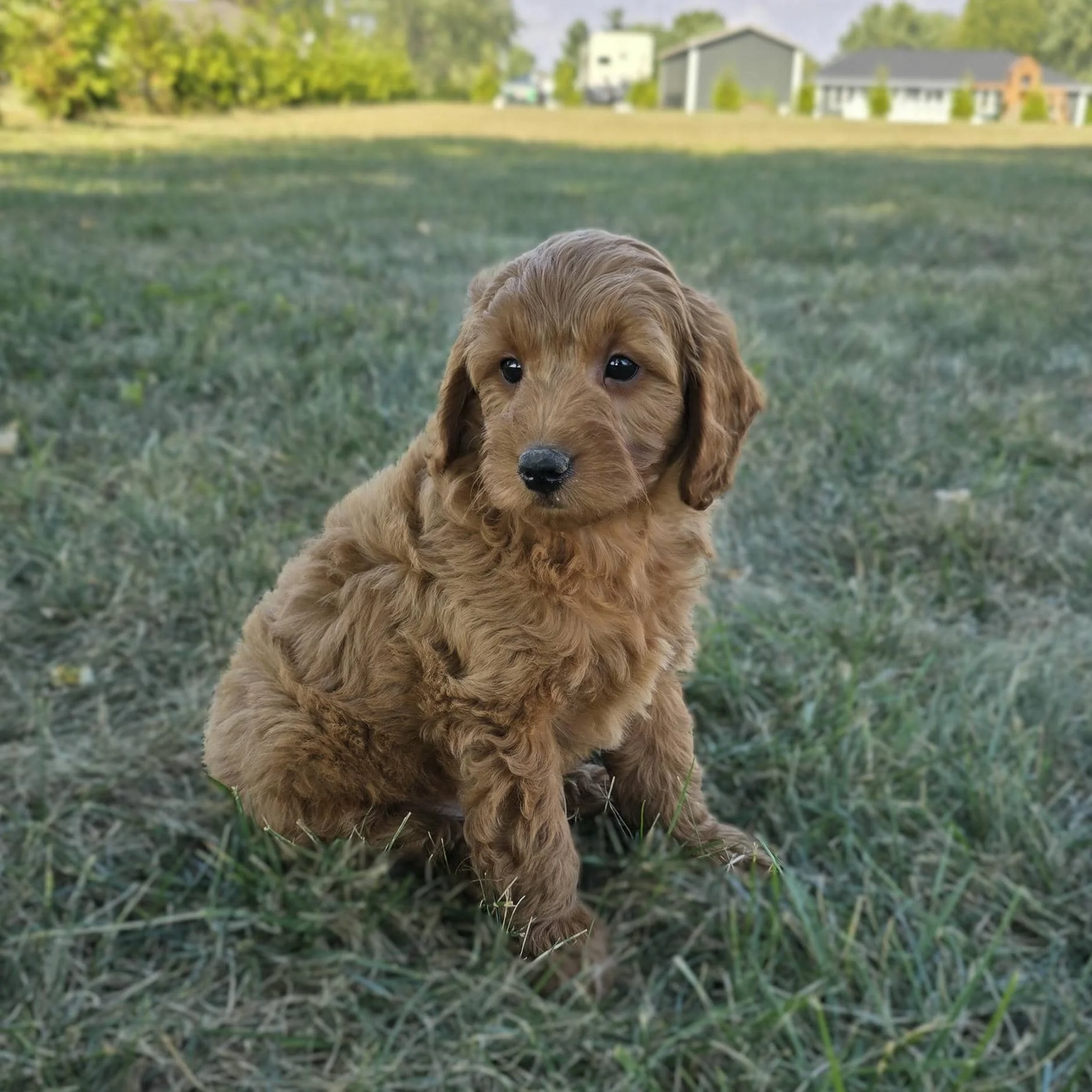 Boy 1763 is a F1B Mini Goldendoodle. He’s 75% Mini Poodle and 25% Golden Retriever. He was born on Aug. 6th, 2025, and will weigh approx. 18 lbs when he’s fully grown. He’ll be ready to go to his new home on or after Oct. 7th, 2025. His dad is a 6.5 lb. Miniature Poodle, and his mom is a 22 lb. Mini Goldendoodle, so he’ll have some great traits from both. By the time he’s ready to leave, he’ll be well socialized and friendly.