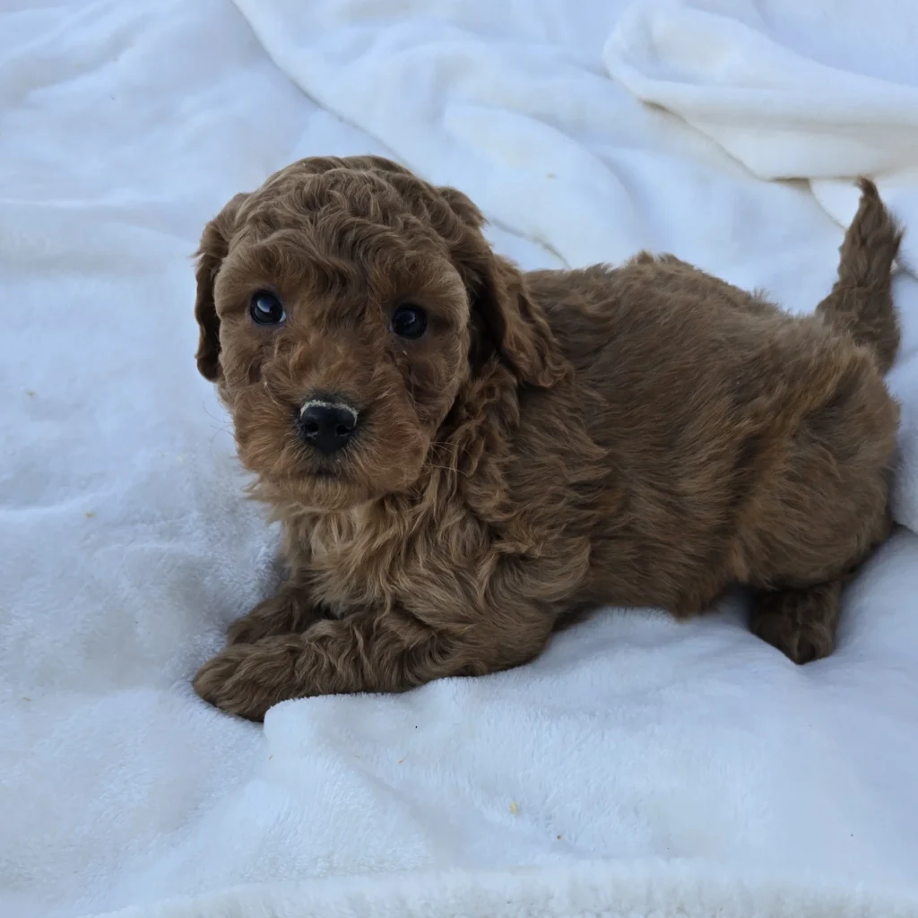 Meet Girl 1242, a sweet and well-bred F1B Mini Goldendoodle! She was born on December 8, 2025, and is expected to be 20–30 lbs fully grown — an ideal size for both active families and cozy homes. She’ll be ready to go home on or after February 7, 2026.