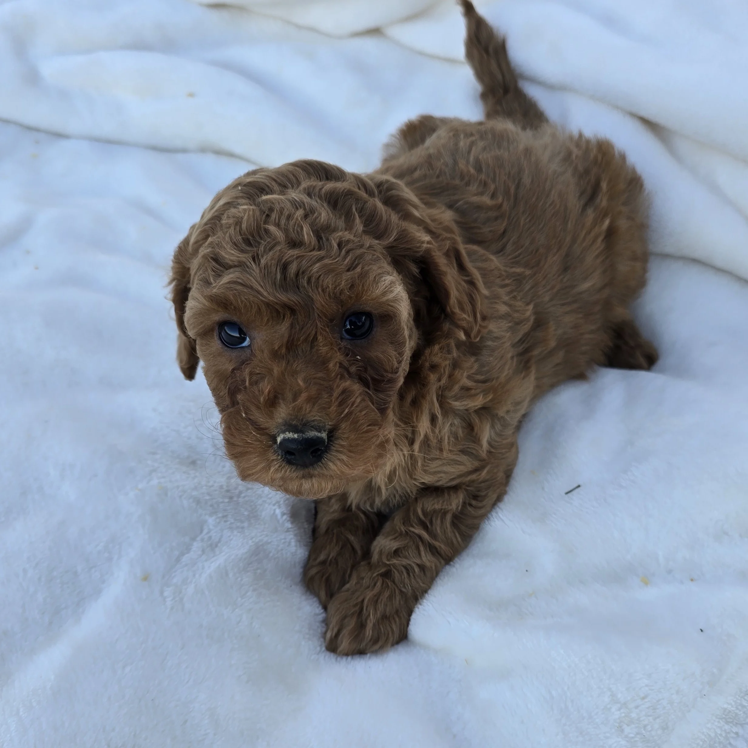 Meet Girl 1242, a sweet and well-bred F1B Mini Goldendoodle! She was born on December 8, 2025, and is expected to be 20–30 lbs fully grown — an ideal size for both active families and cozy homes. She’ll be ready to go home on or after February 7, 2026.