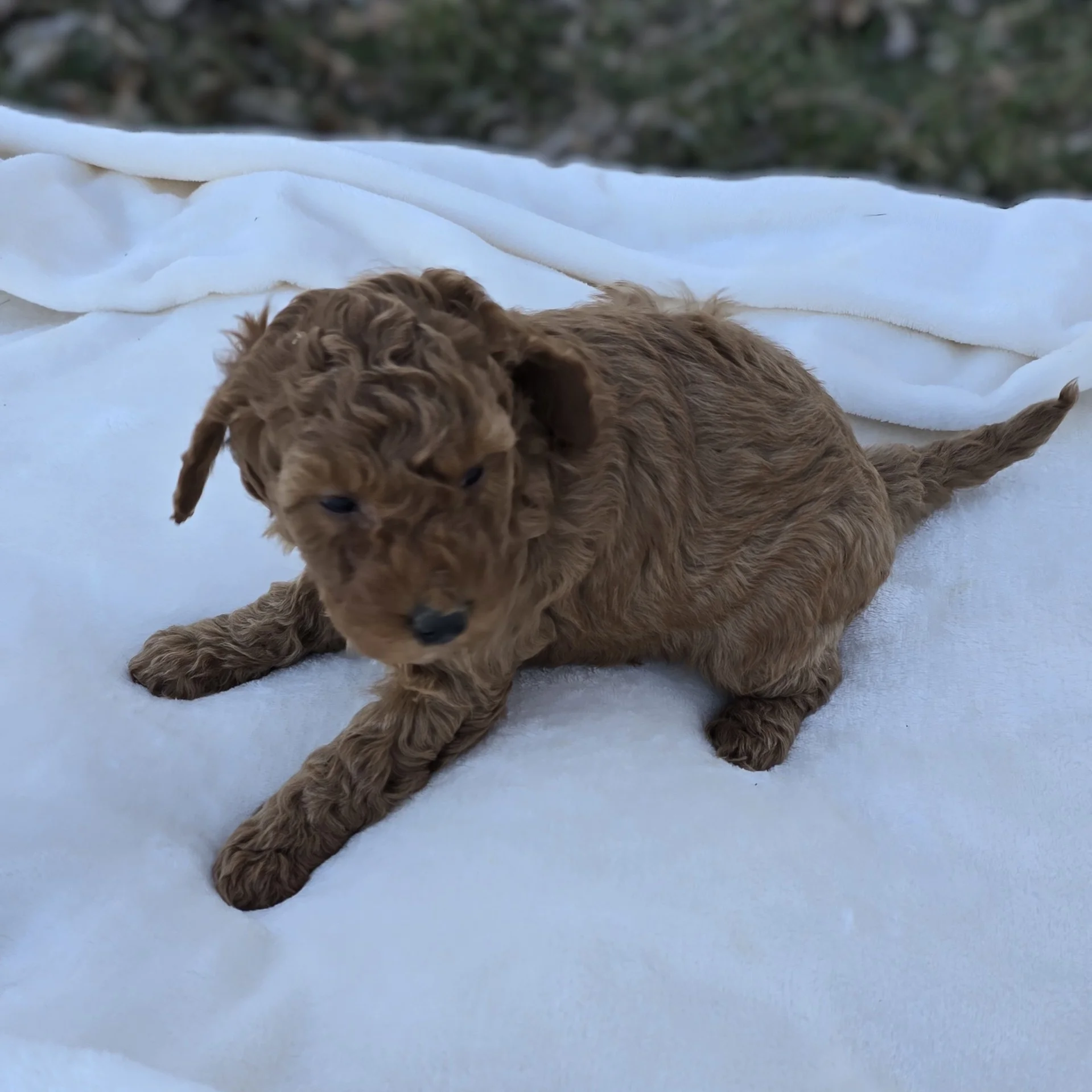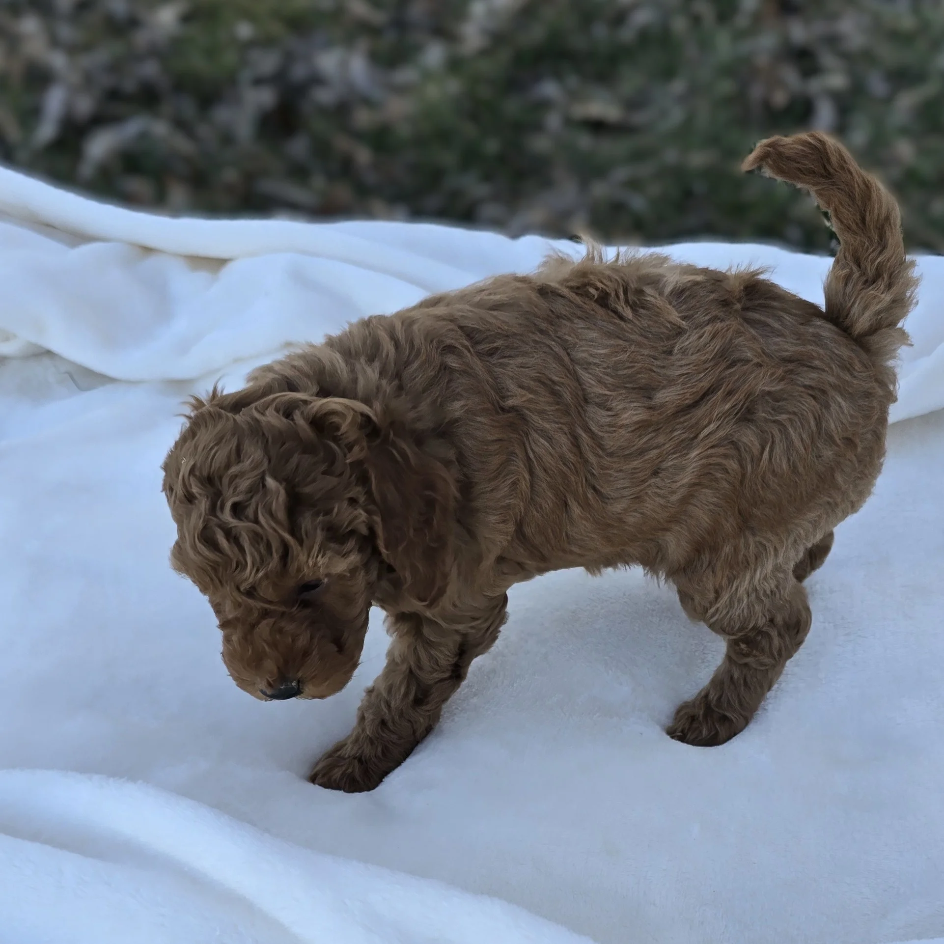 Her father is a 6.5 lb Miniature Poodle, and her mother is a 30 lb Mini Goldendoodle, giving her a fantastic combination of intelligence, friendliness, and low-shedding coat potential. She is being carefully raised and will be well-socialized, affectionate, and ready to bond with her new family.