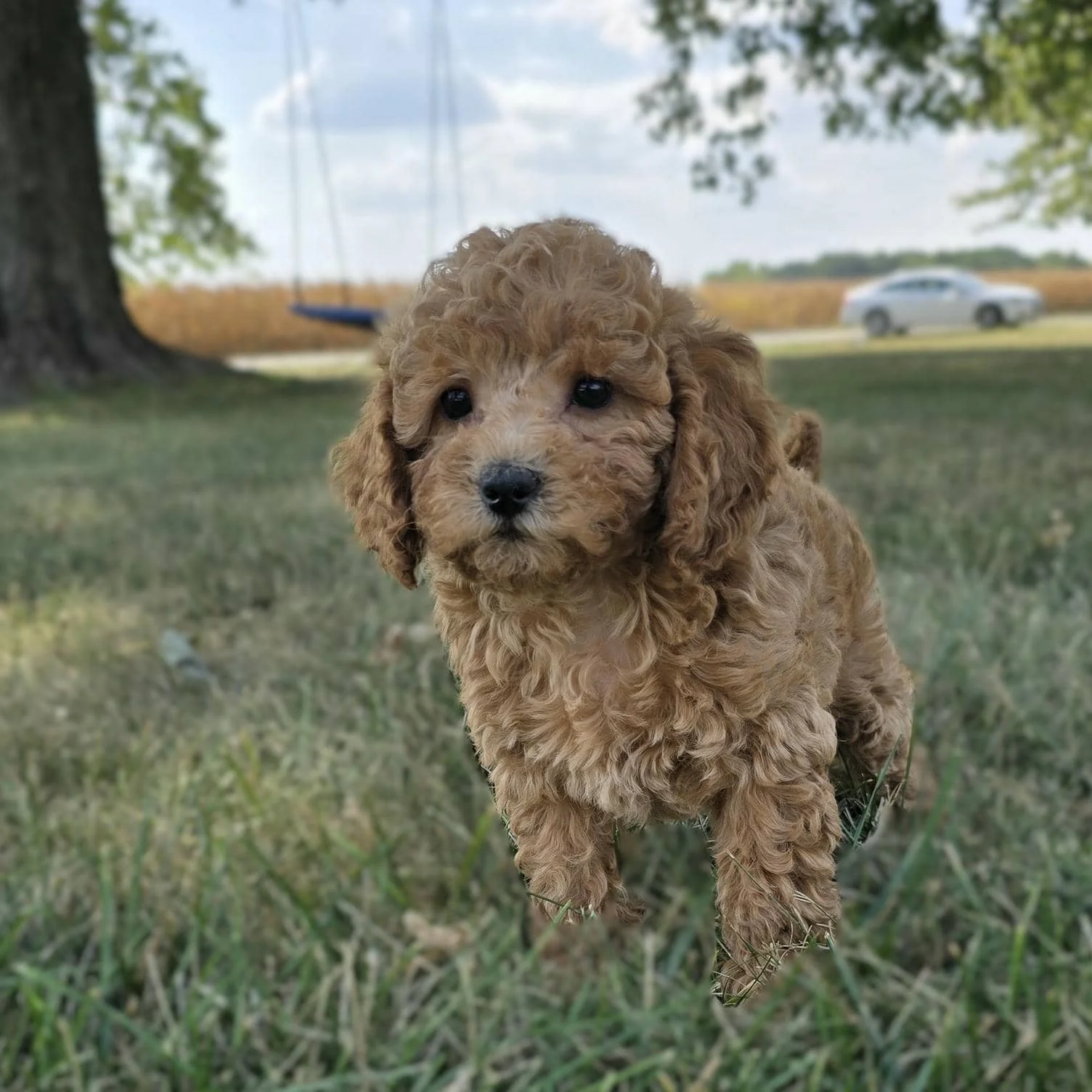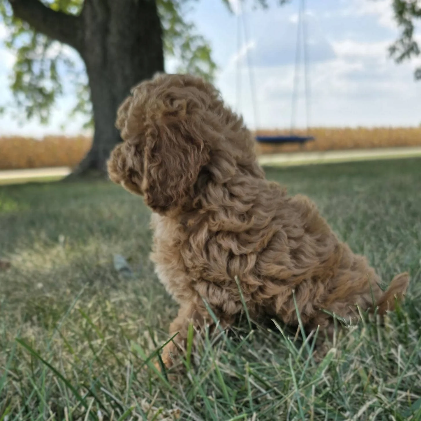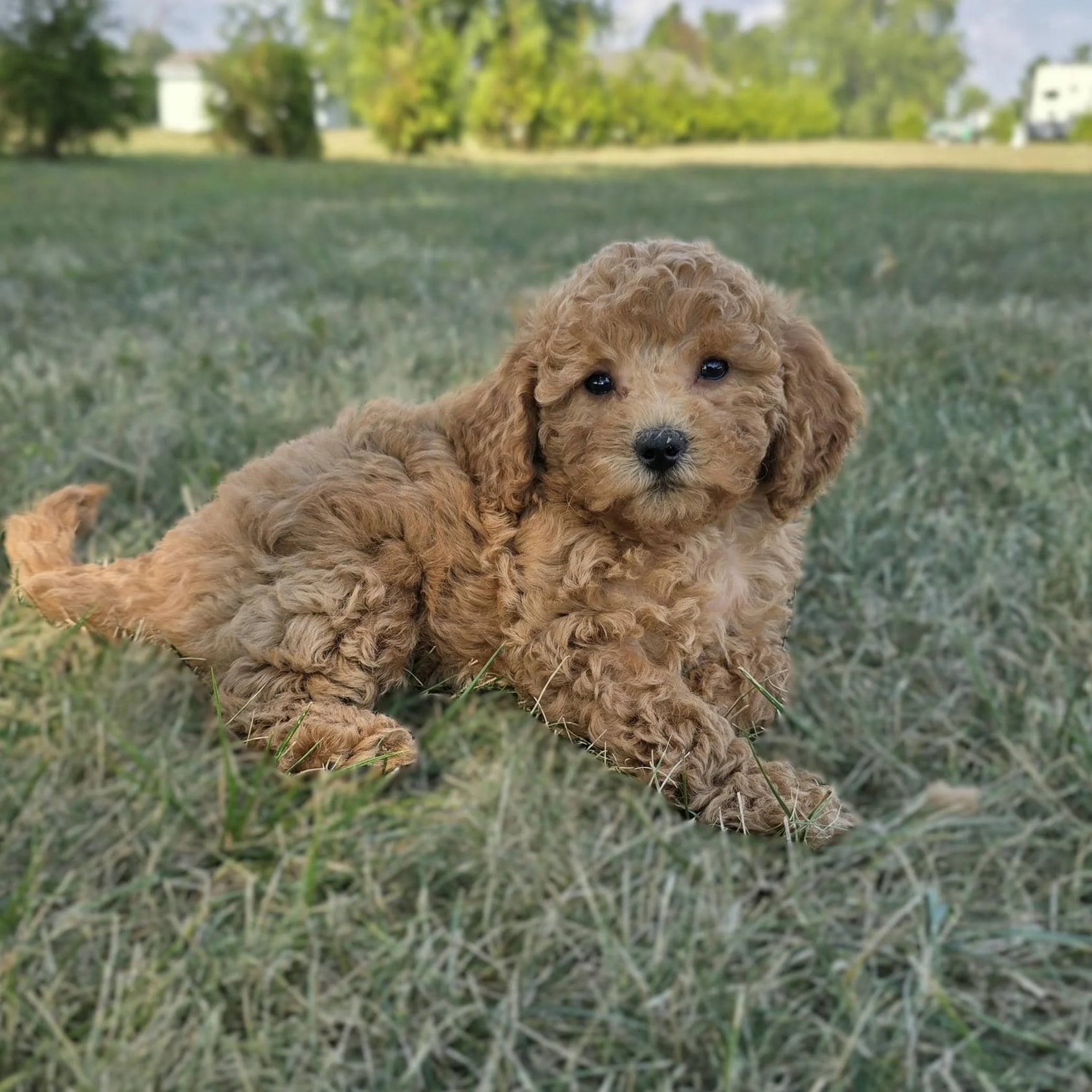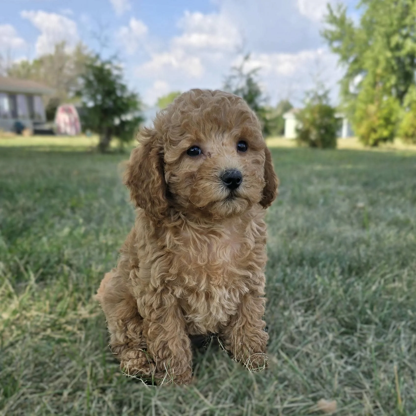 Girl 1774 is a F1B Mini Goldendoodle. She’s 75% Mini Poodle and 25% Golden Retriever. She was born on Aug. 6th, 2025, and will weigh approx. 12 lbs when she’s fully grown. She’ll be ready to go to her new home on or after Oct. 7th, 2025. Her dad is a 6.5 lb. Miniature Poodle, and her mom is a 22 lb. Mini Goldendoodle, so she’ll have some great traits from both. By the time she’s ready to leave, she’ll be well socialized and friendly.