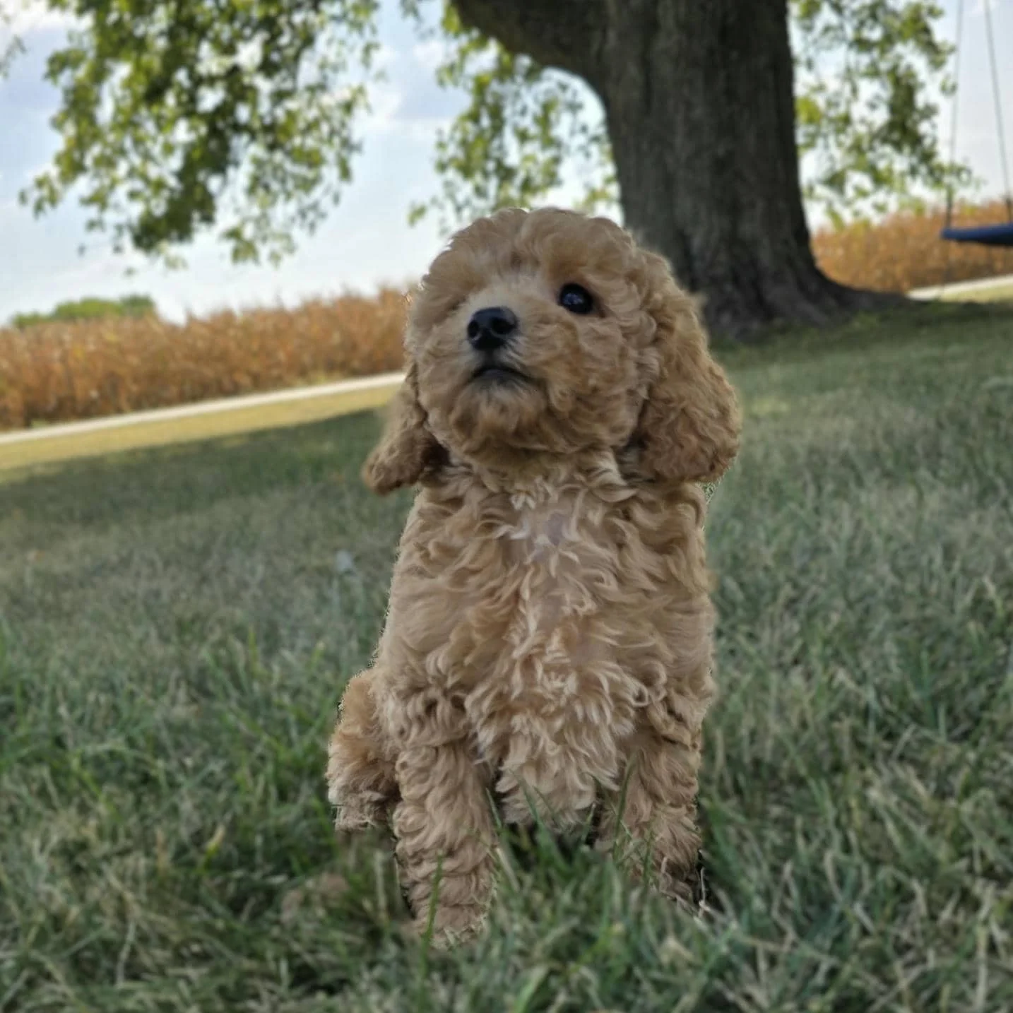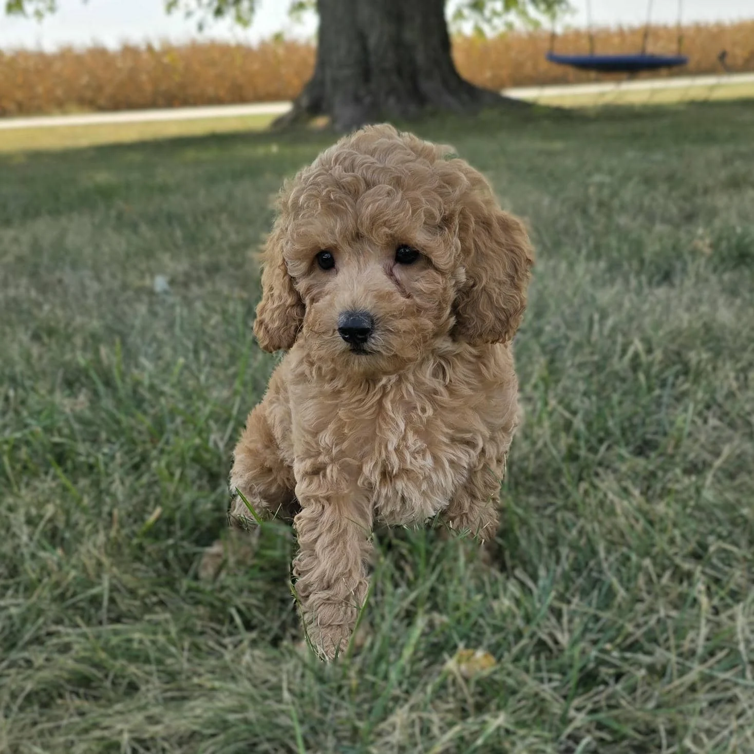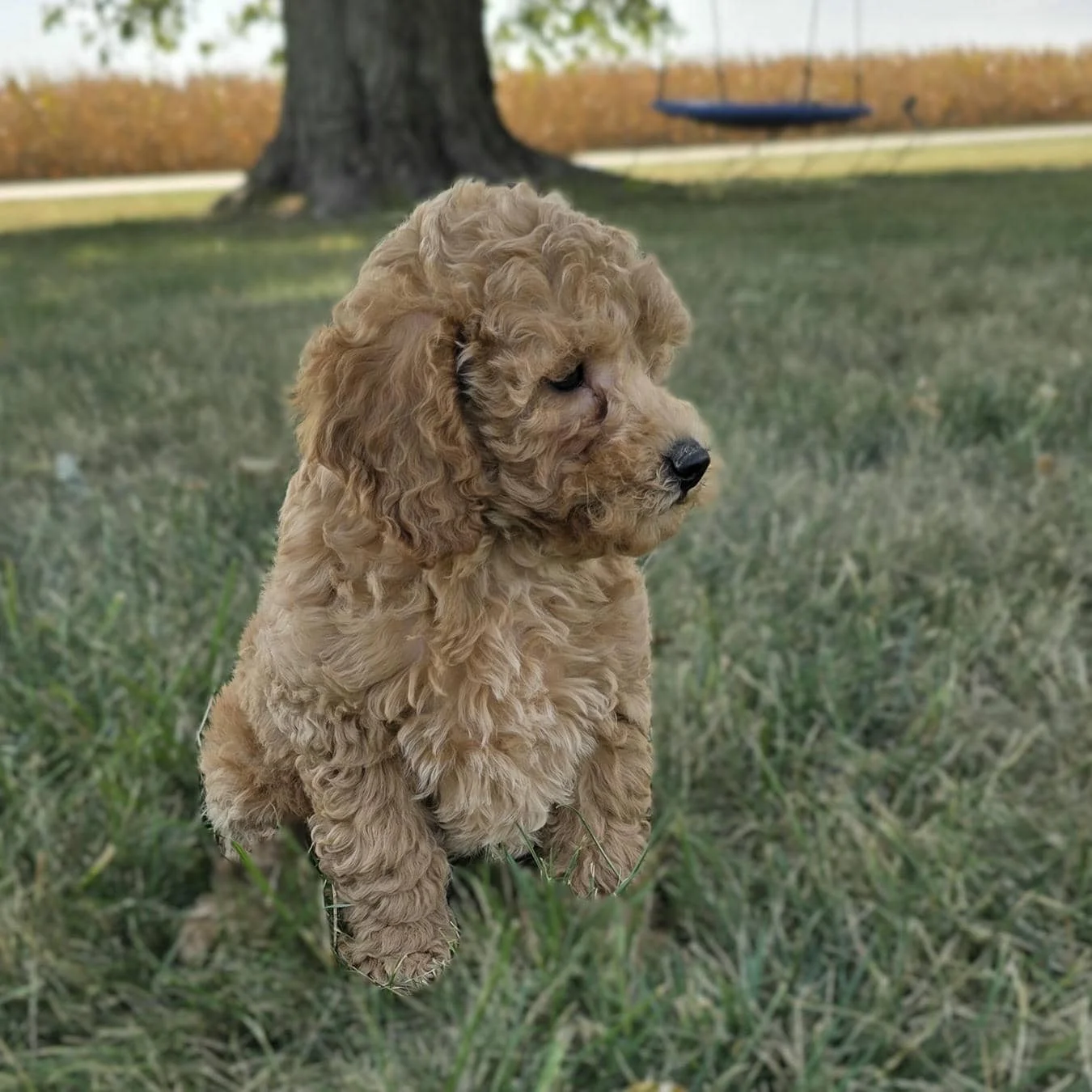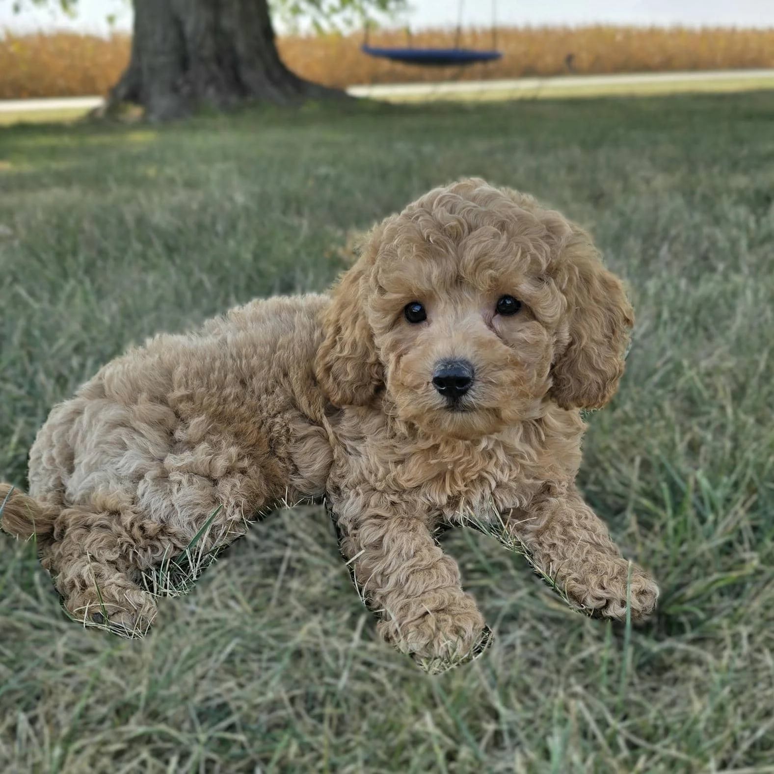 Girl 1782 is a F1B Mini Goldendoodle. She’s 75% Mini Poodle and 25% Golden Retriever. She was born on Aug. 6th, 2025, and will weigh approx. 15 lbs when she’s fully grown. She’ll be ready to go to her new home on or after Oct. 7th, 2025. Her dad is a 6.5 lb. Miniature Poodle, and her mom is a 22 lb. Mini Goldendoodle, so she’ll have some great traits from both. By the time she’s ready to leave, she’ll be well socialized and friendly.