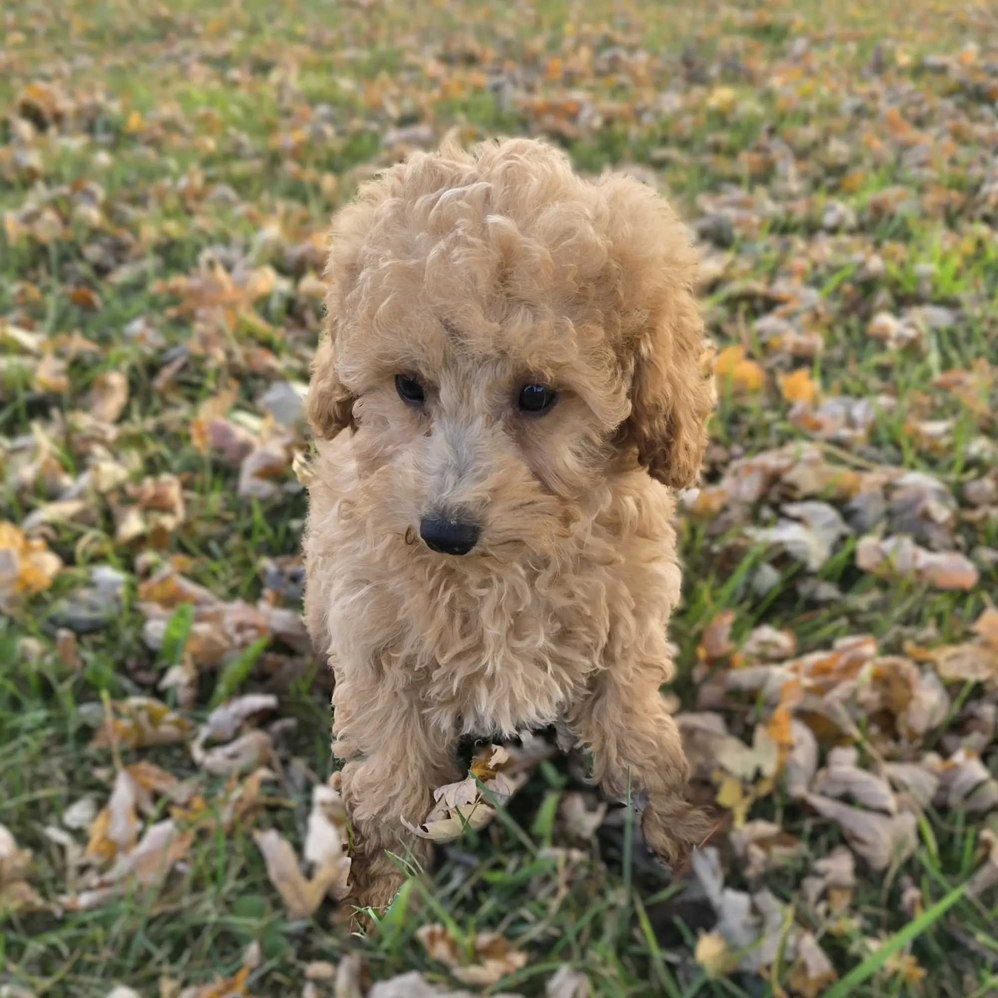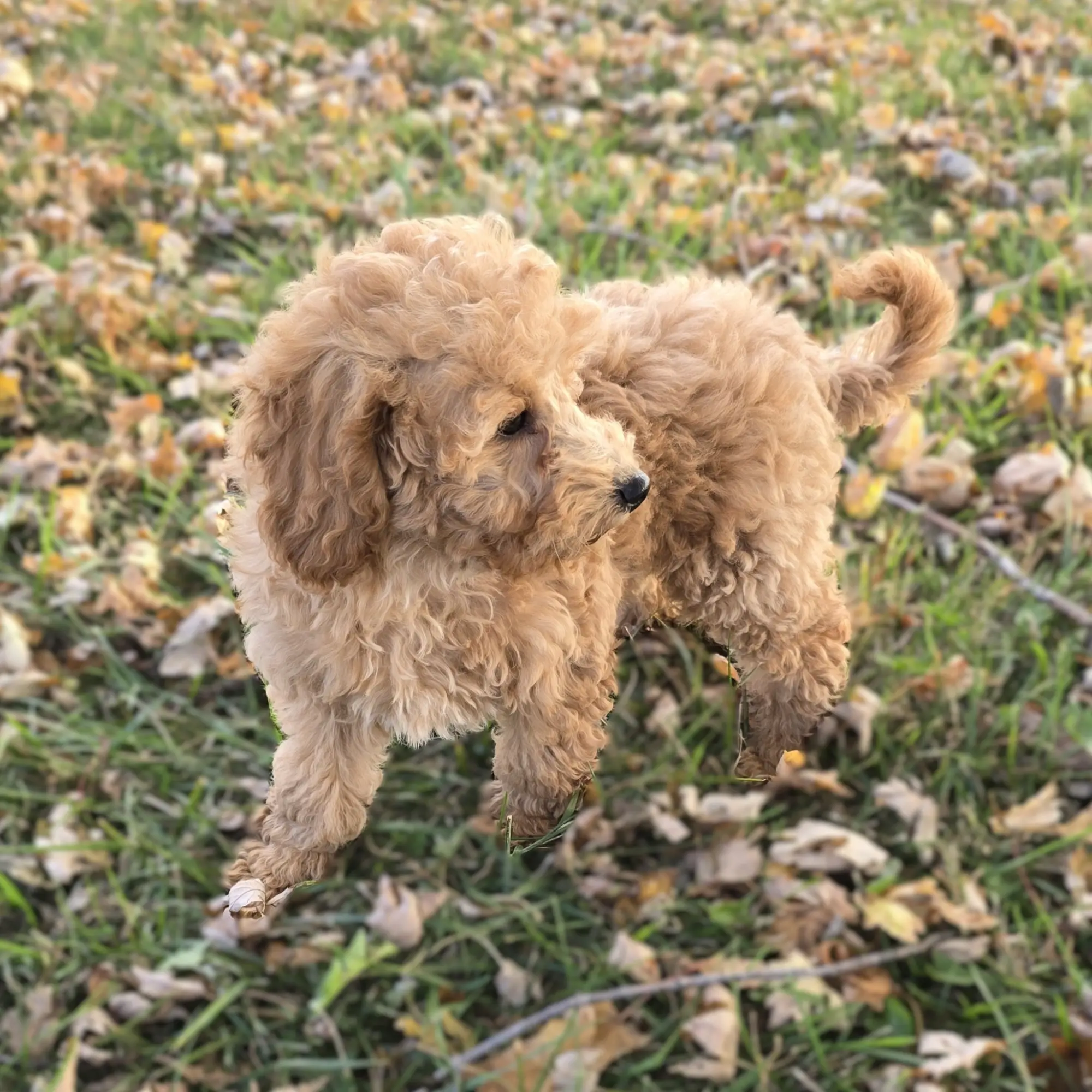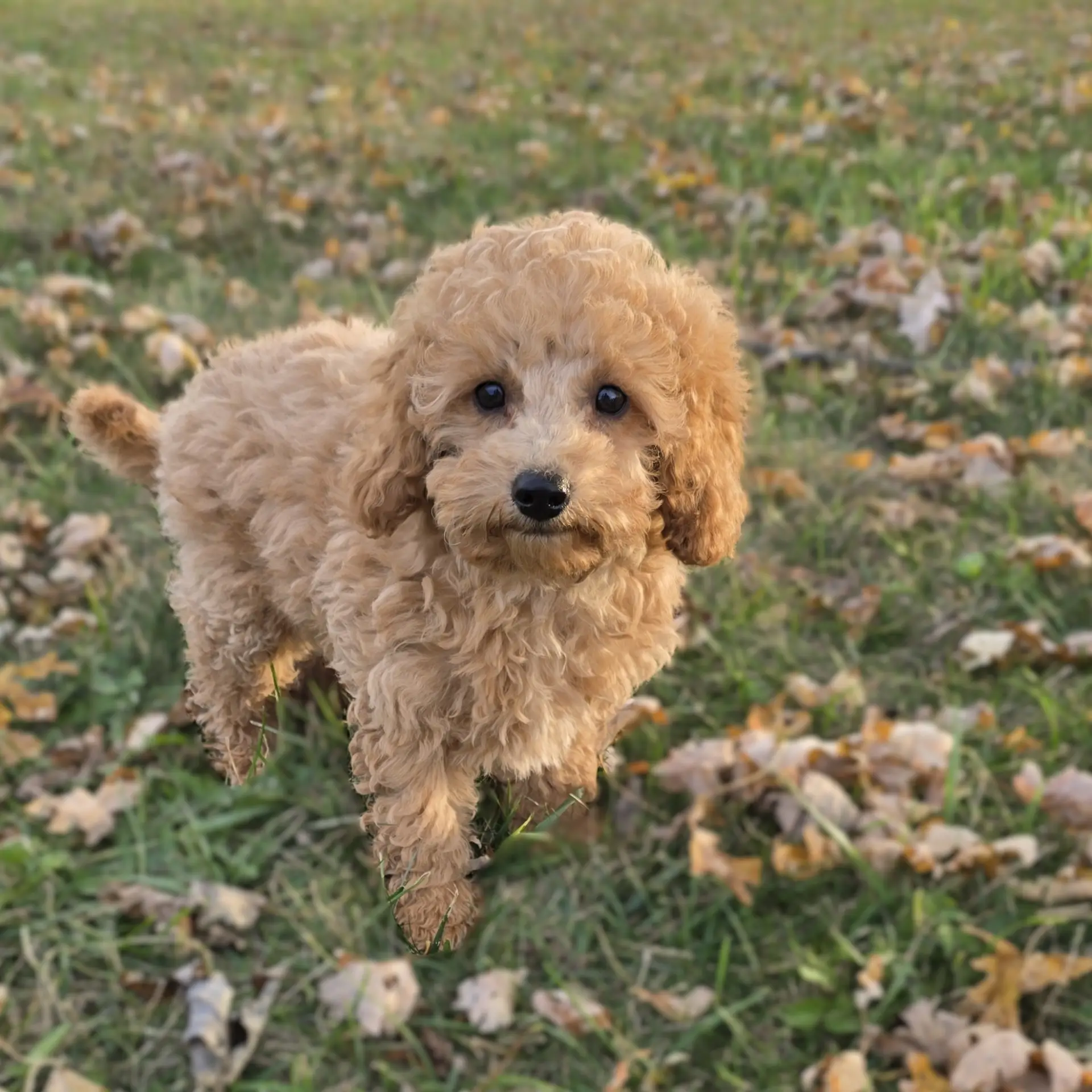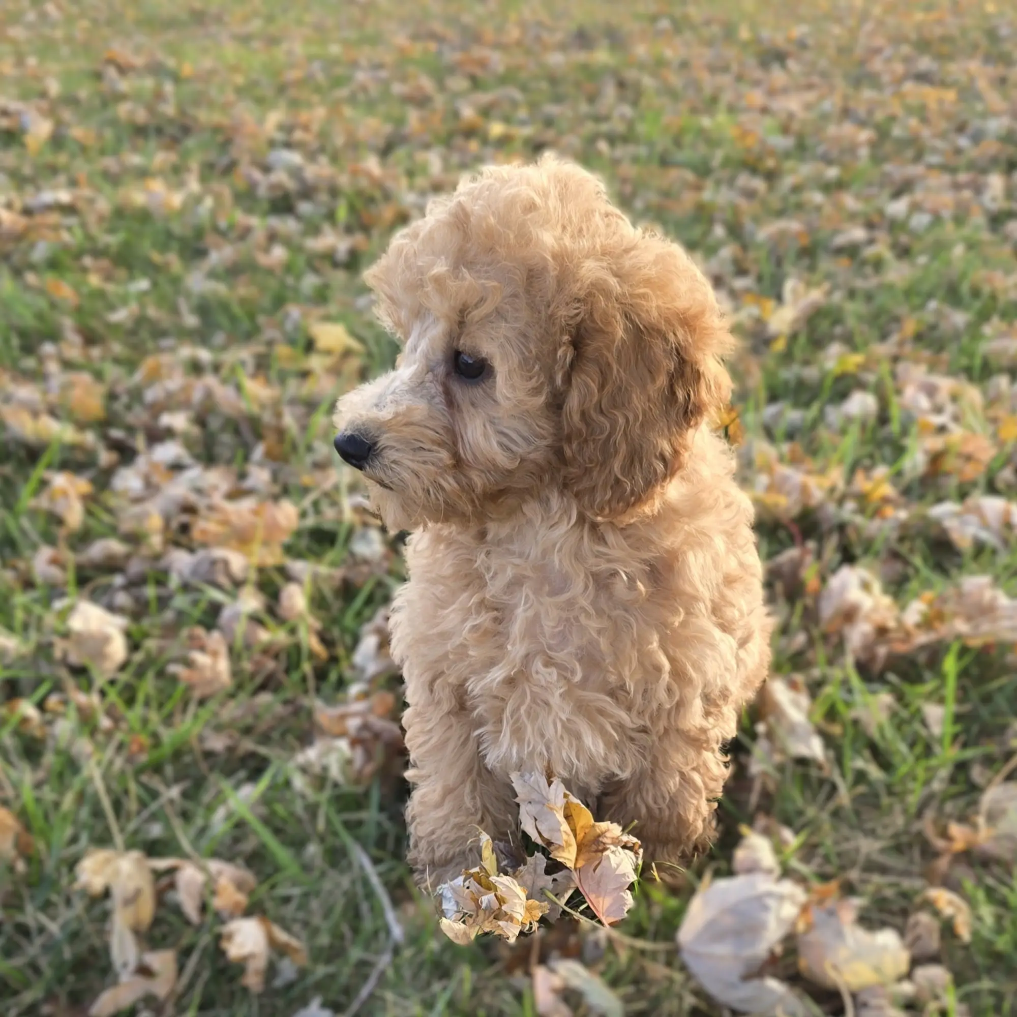 Girl 1782 is a F1B Mini Goldendoodle. She’s 75% Mini Poodle and 25% Golden Retriever. She was born on Aug. 6th, 2025, and will weigh approx. 15 lbs when she’s fully grown. She is ready to go to her new home! Her dad is a 6.5 lb. Miniature Poodle, and her mom is a 22 lb. Mini Goldendoodle, so she’ll have some great traits from both. By the time she’s ready to leave, she’ll be well socialized and friendly.