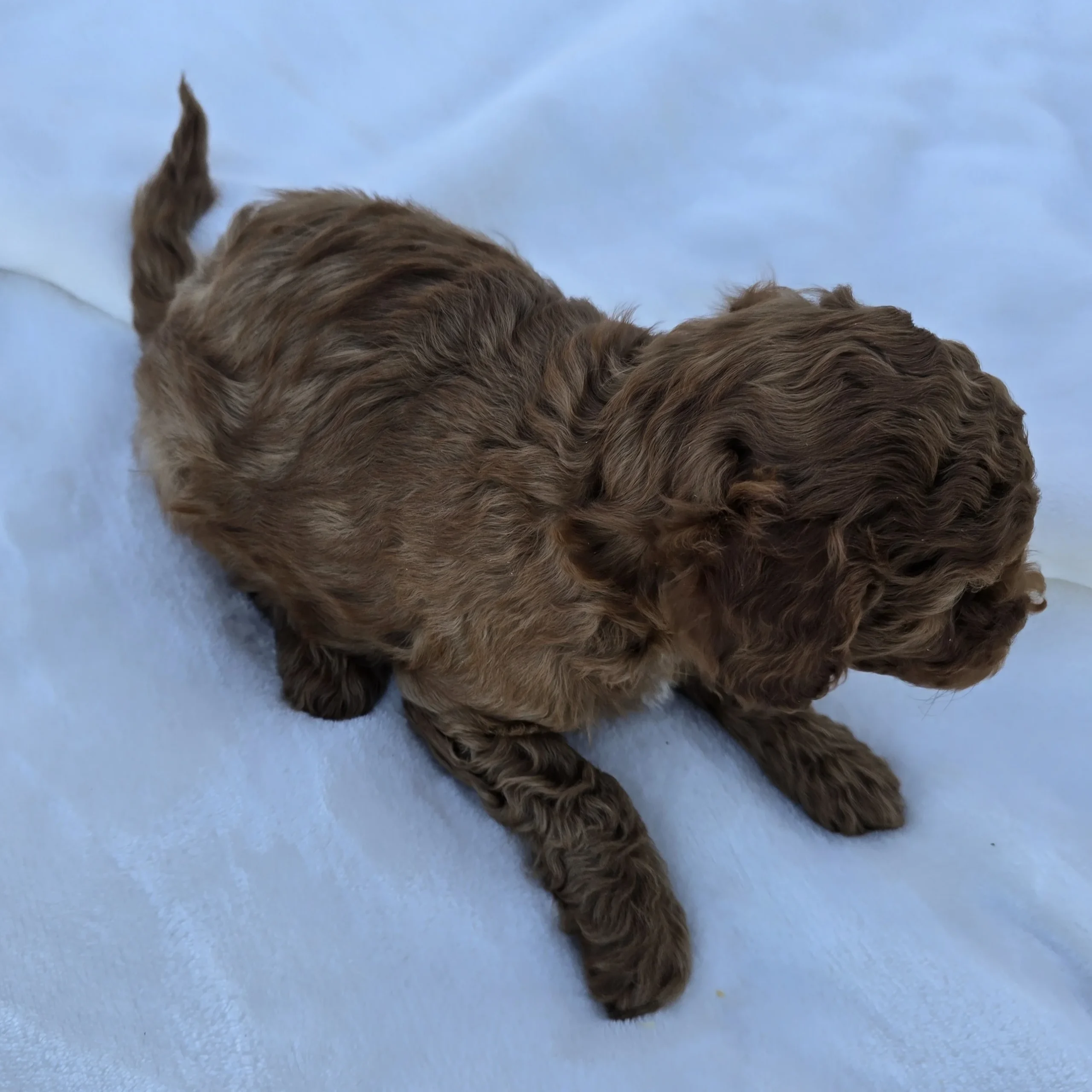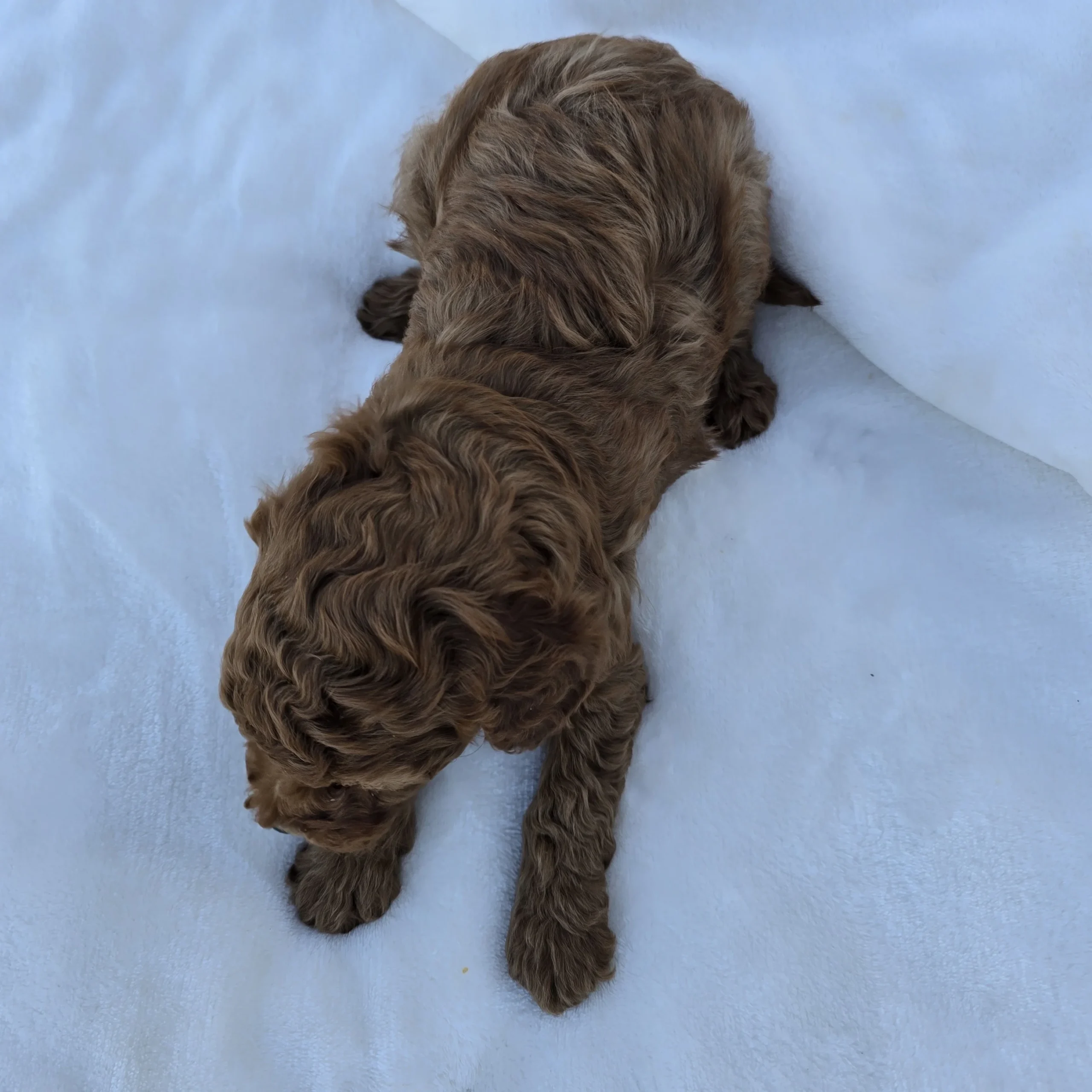 Meet Girl 4212, a sweet and well-bred F1B Mini Goldendoodle! She was born on December 8, 2025, and is expected to be 20–30 lbs fully grown — an ideal size for both active families and cozy homes. She’ll be ready to go home on or after February 7, 2026.